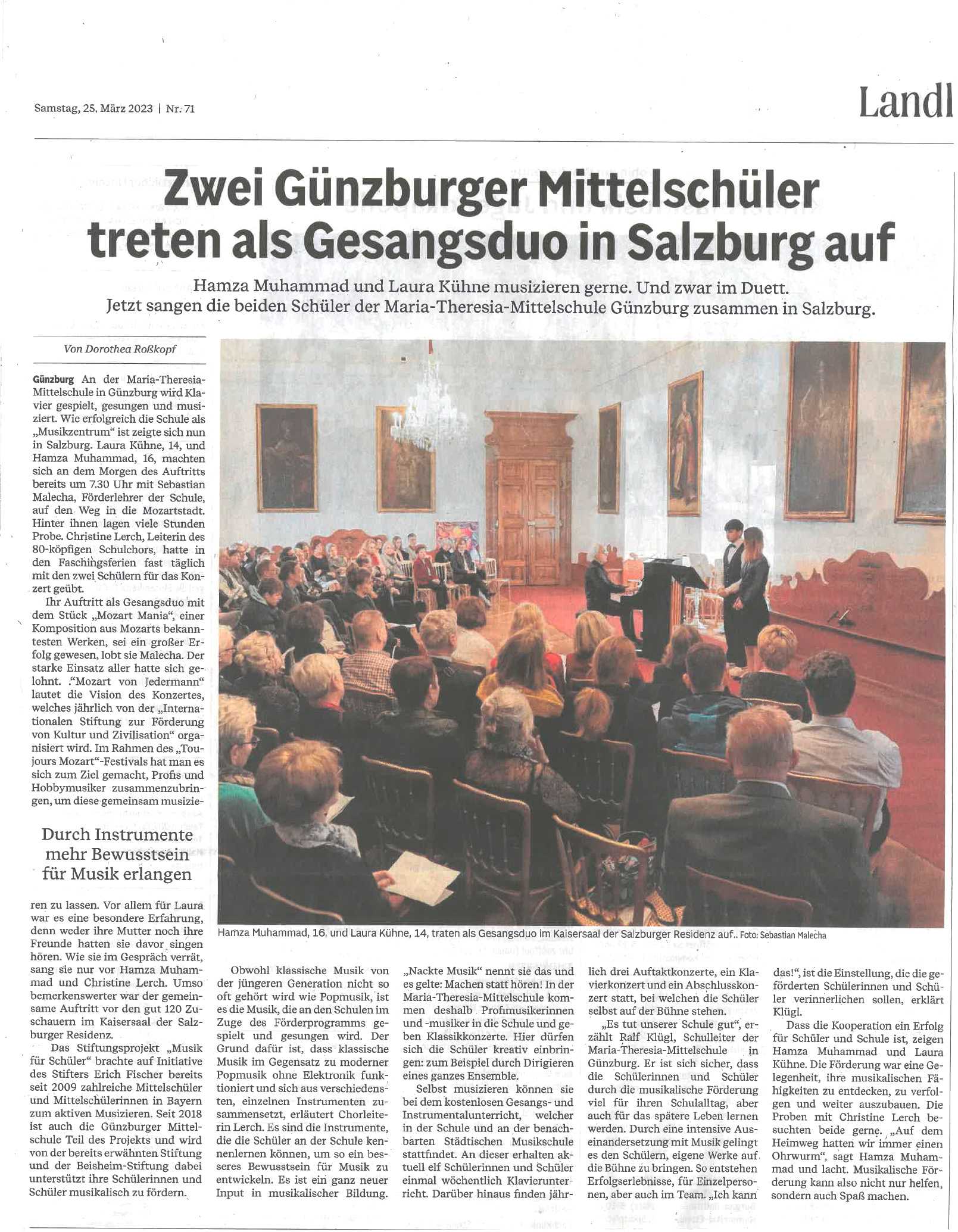 Musik für Schüler | “Zwei Günzburg Mittelschüler treten als Gesangsduo in Salzburg auf” | Augsburger Allgemeine vom 25. März 2023