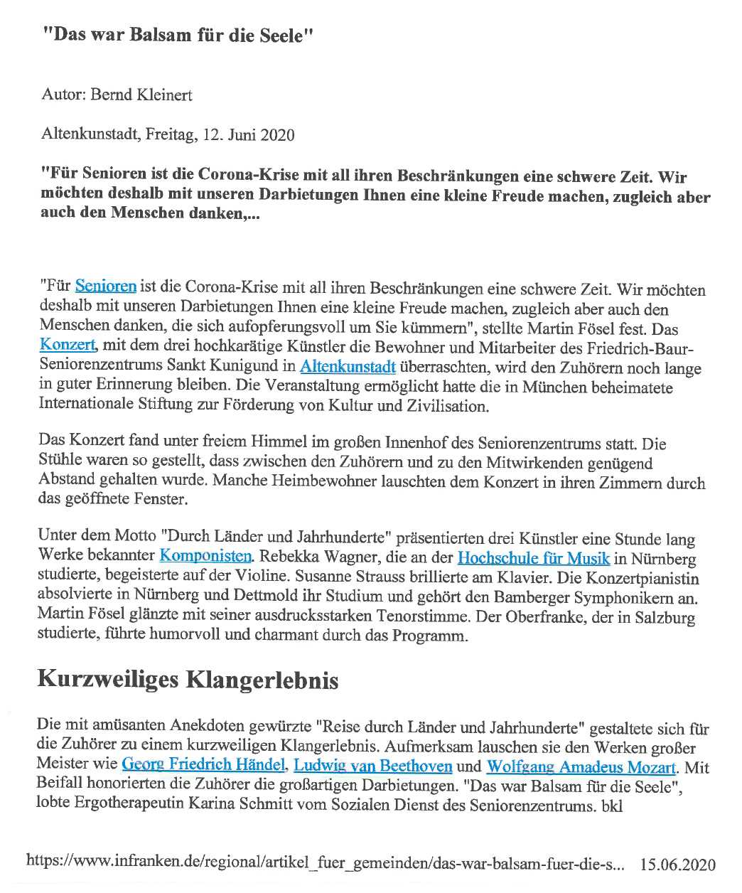 “Das war Balsam für die Seele” | Musik am Nachmittag | Altenkunstadt, 12. Juni 2020