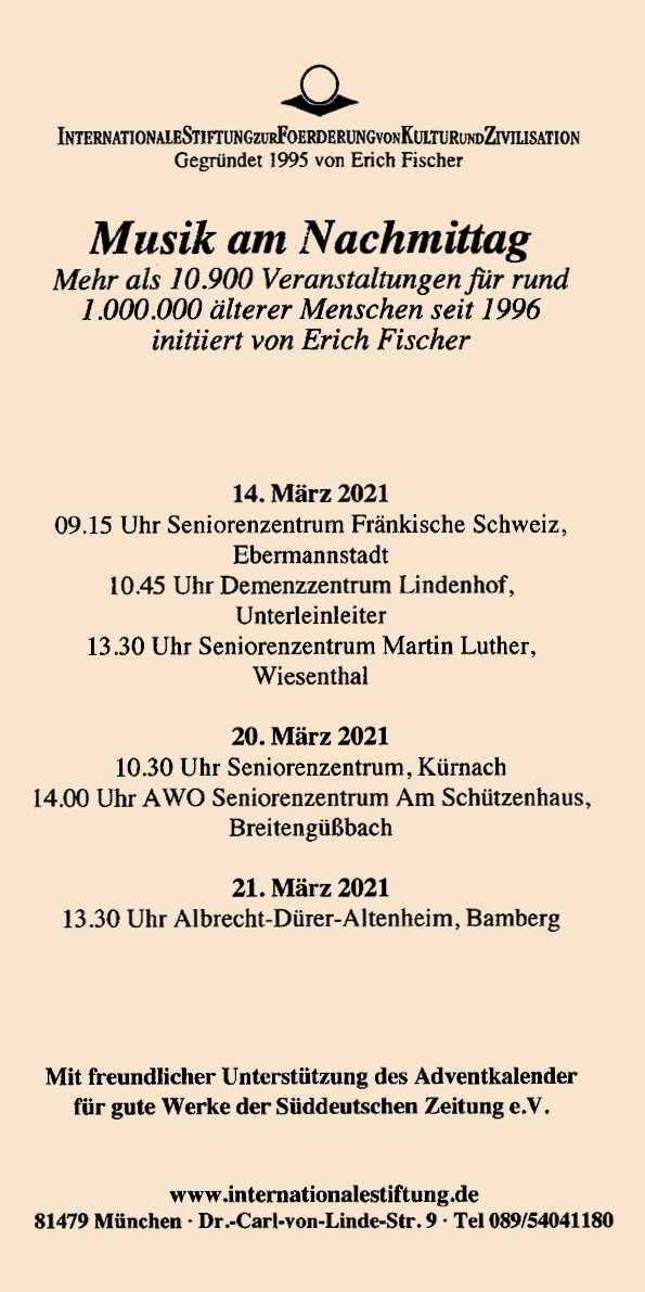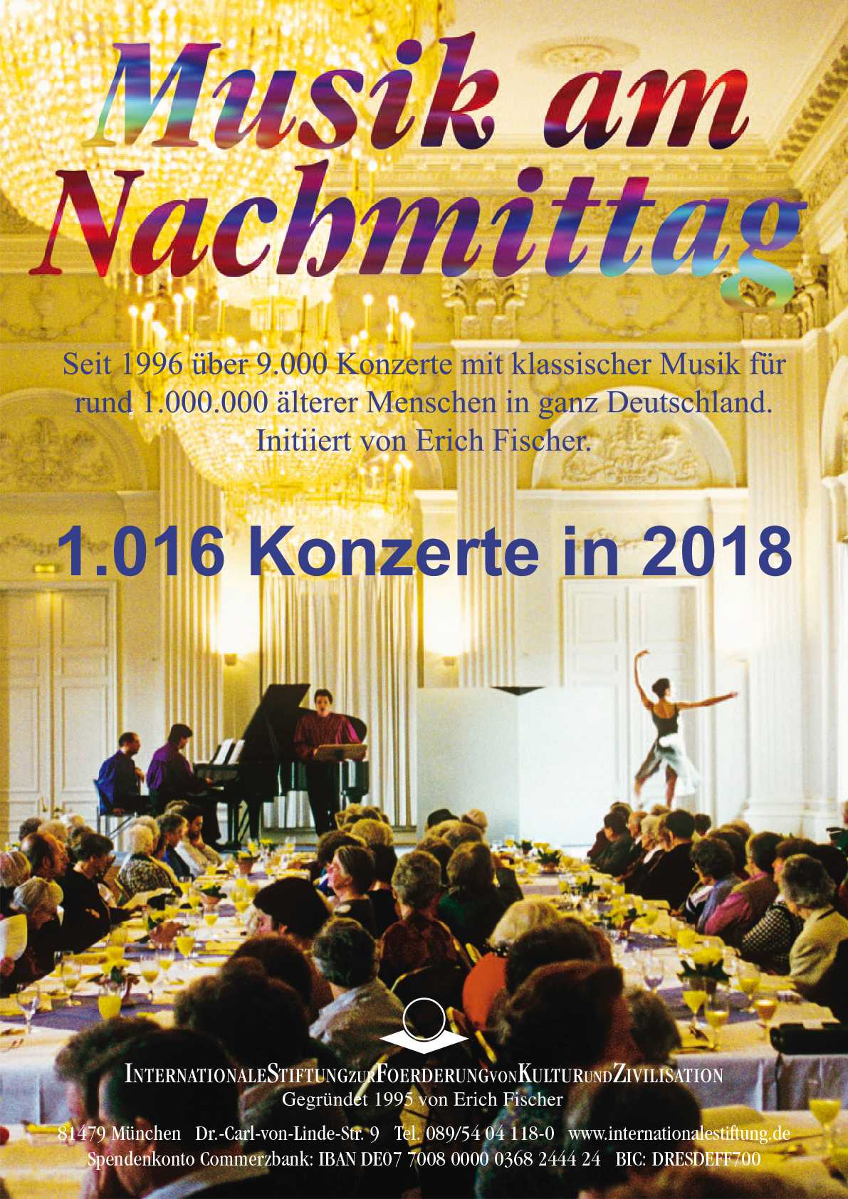 Seit 1996 über 16.100 stimmungsvolle live Konzerte mit klassischer Musik bis 07/2025 für über 1.134.000 begeisterte ältere Menschen. Initiiert und finanziert vom Stifter Erich Fischer als ein besonderes Dankeschön an die Kriegs- und Nachkriegsgenerationen. In festlichen Sälen bei Kaffee und Kuchen oder direkt in Alten- und Pflegeheimen.