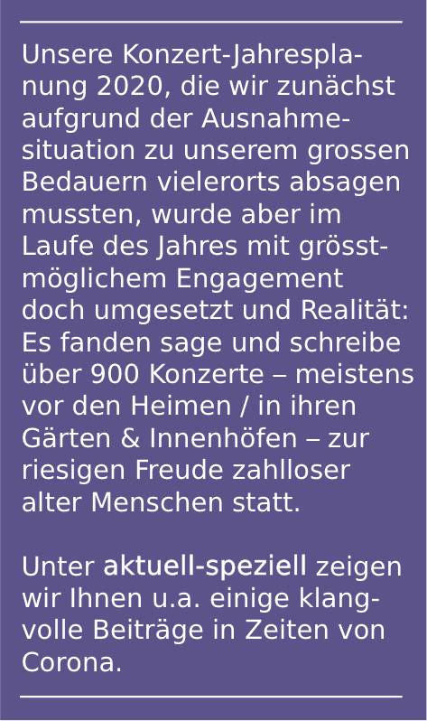 Trotz Pandemie und ursprünglicher Absagen konnten wir in den beiden vergangenen Jahren, Dank größtmöglichem Engagement, letztlich sage und schreibe je über 900 Konzerte realisieren – zur riesigen Freude zahlloser älterer Menschen.