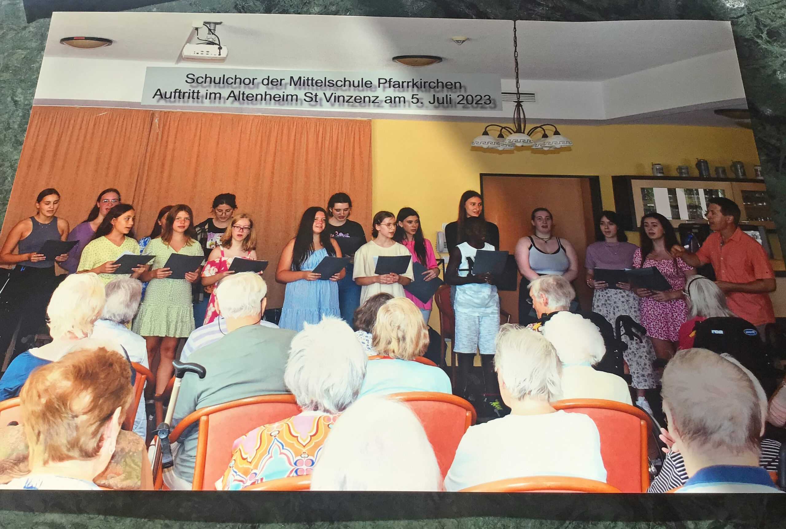 Ein erfreuliches Beispiel unseres Stiftungsalltags | der Schulchor der Mittelschule Pfarrkirchen bei seinem Auftritt im Altenheim St. Vinzenz | 5. Juli 2023