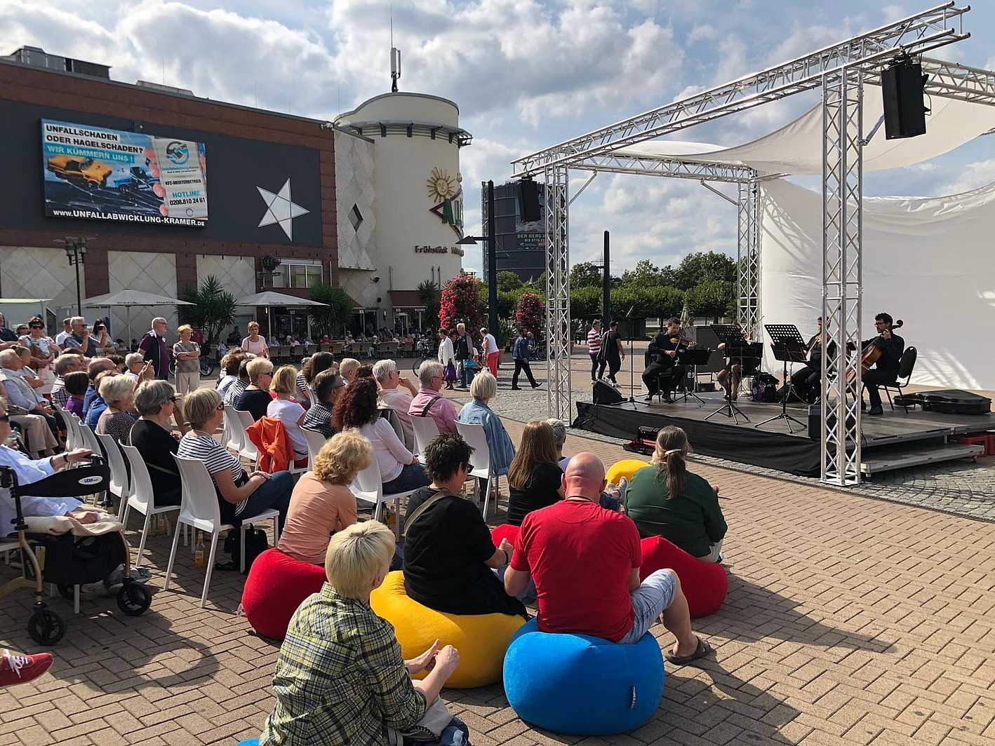 Es ist natürlich nicht zu vergleichen mit einer Aufführung in einem Saal und um ehrlich zu sein hatte ich manchmal Probleme, mich auf das Geschen zu konzentrieren; die Flugzeuge, hupende E-Scooter, tobende Kinder, bellende Hunde und … der Kirchturm, der zwei mal, zur vollen Stunde, alles gegeben hat - und zwar mit Erfolg - die Musik und den Gesang auf dem Platz zu übertönen 😁